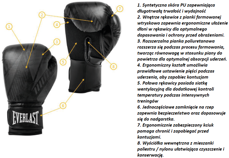 Wykonane z wysokiej jakości skóry syntetycznej rękawice zapewniają długotrwałą trwałość i wydajność. Dzięki zastosowaniu innowacyjnej technologii EVERCOOL, siateczkowe panele wentylacyjne rękawic utrzymują regulację wilgotności i temperatury podczas intensywnych treningów. Wewnętrzny kształt rękawicy zapewnia dodatkową ochronę, gdy wyprowadzasz ciosy. Technologia pianki o zamkniętych komórkach zapewnia najwyższą ochronę dłoni, dzięki czemu możesz wykonywać najskuteczniejsze uderzenia podczas treningu.